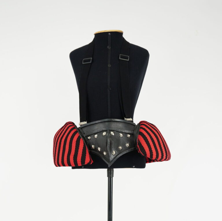 agosto 31, 2025 by Michelle Araujo Leia Mais...Anca listrada vermelha e preta com codpiece/braguilha em couro com taxas metálicas e suspensório em alça trançada preta com reguladores plásticos.