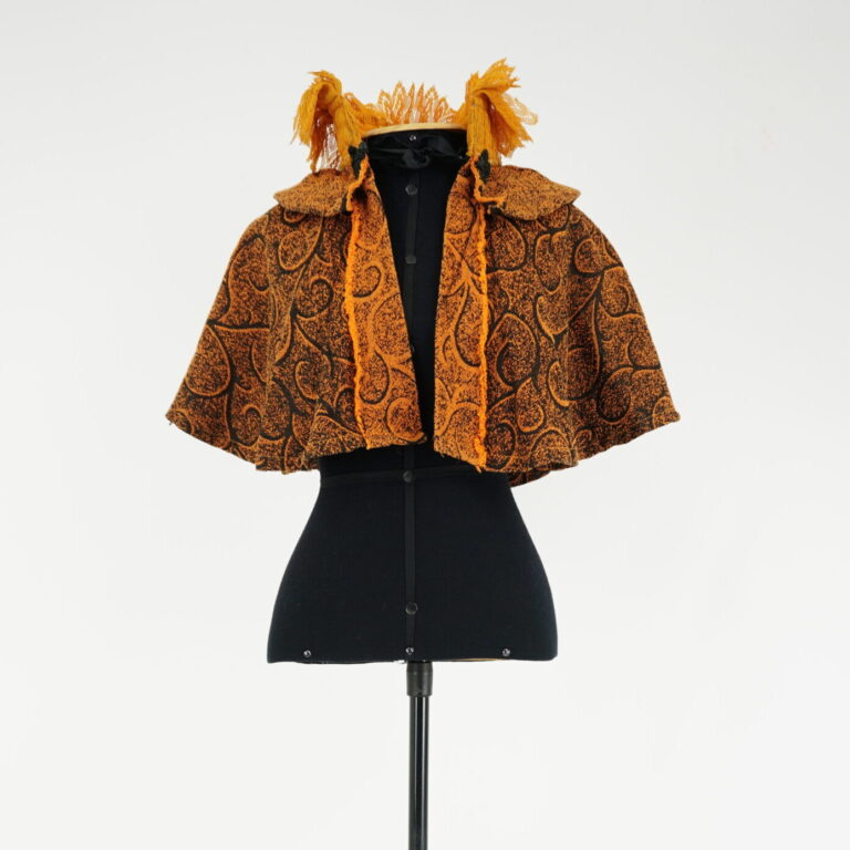 agosto 31, 2025 by Michelle Araujo Leia Mais...Bolero de jacquard preto com laranja, rufo laranja no pescoço com amarração de fita de veludo