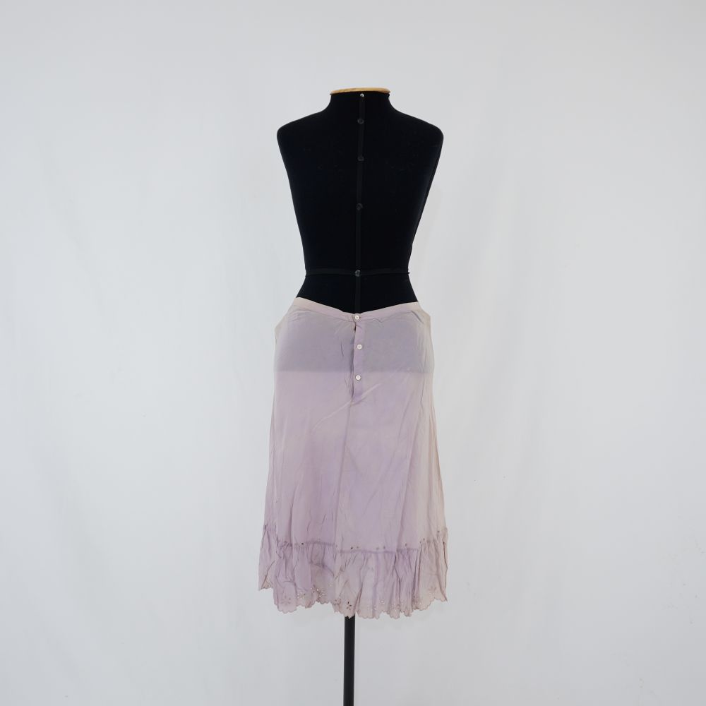 by Michelle Araujo Leia Mais...Saia curta lilás evasê com babados e bordados florais na barra, fechamento em três botões na lateral de madrepérola