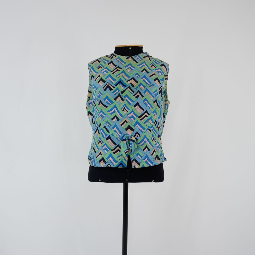 by Michelle Araujo Leia Mais...Blusa sem mangas, com recorte circular abaixo no busto com laço costurado, estampa geométrica verde, preto, azul claro, azul bic, bege e rosa. Fechamento no centro costas com...