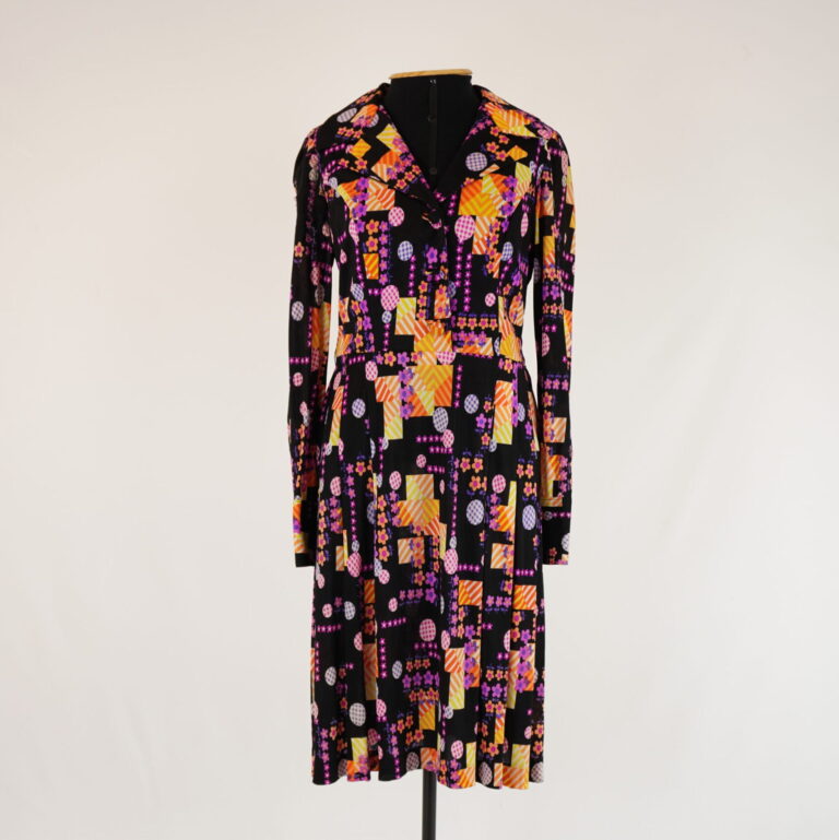 agosto 31, 2025 by Michelle Araujo Leia Mais...Vestido manga longa em tecido sintético estampado de fundo preto nas cores laranja, vermelho, branco, amarelo, roxo e rosa. Botão encapado de pezinho no fechamento do busto e...