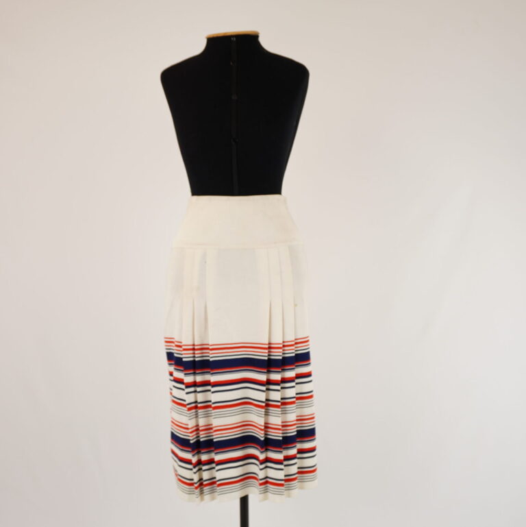 agosto 31, 2025 by Michelle Araujo Leia Mais...Saia branca em tricô com pregas, estampa de listras marinho com vermelho.
