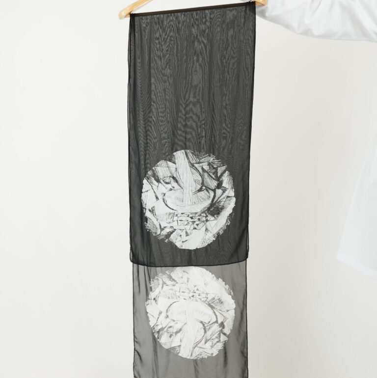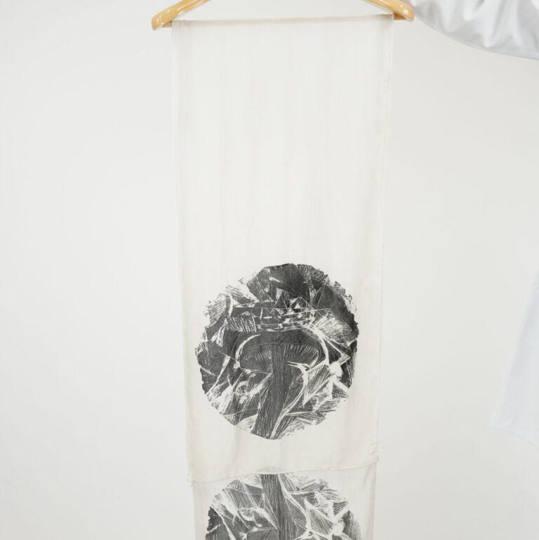agosto 31, 2025 by Michelle Araujo Leia Mais...Lenço branco voal, com transparência e estampa em serigrafia preta próximo das barras em ambos os lados.