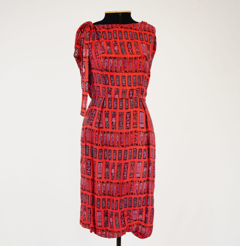 agosto 22, 2025 by Michelle Araujo Leia Mais...Vestido midi com pregas rosa estampado em lilás e preto; sem mangas, com fechamento na lateral em zíper e botões no ombro esquerdo e fita no ombro direito.
