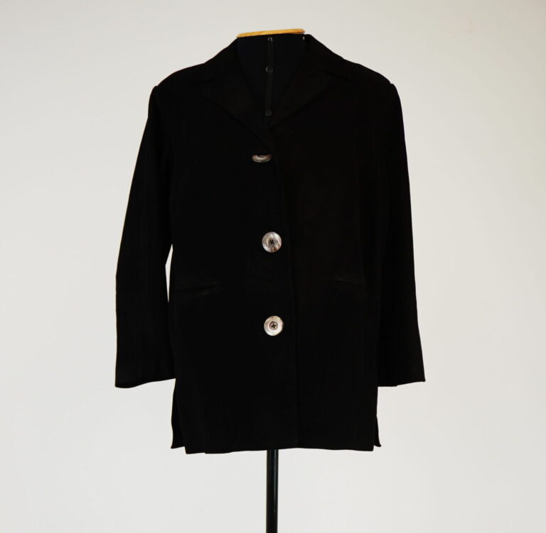 agosto 22, 2025 by Michelle Araujo Leia Mais...Blazer preto com dois bolsos faca, forro azul/roxo e fechamento por botões