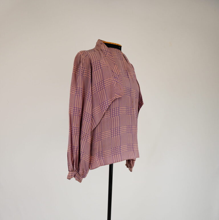Camisa 100% seda de mangas bufantes longas estampanda com sobreposição fixa estilo bolero.