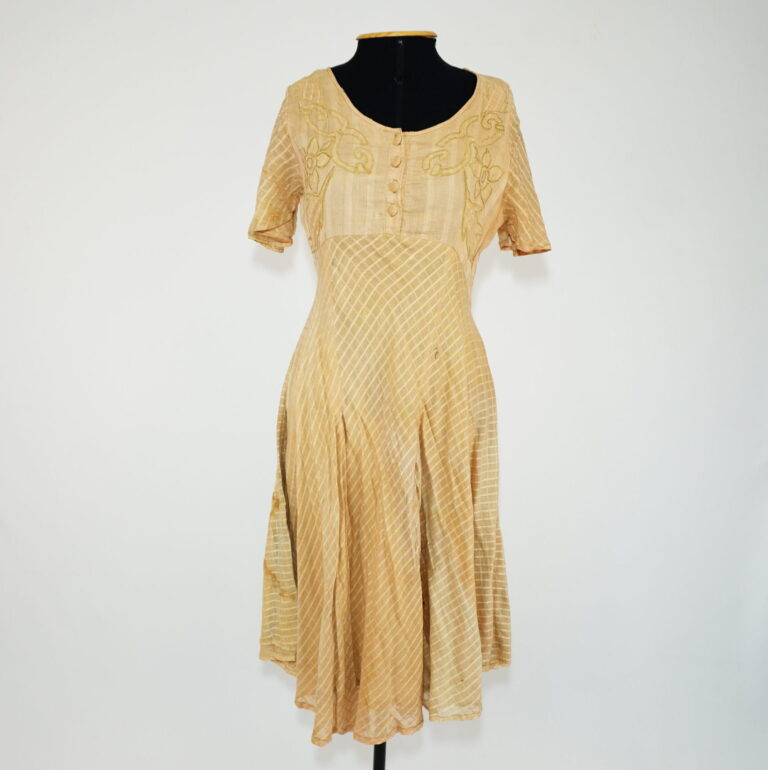 agosto 22, 2025 by Michelle Araujo Leia Mais...Vestido bege de saia godê, com bordado no busto e fechamento em botão encapado e saia godê
