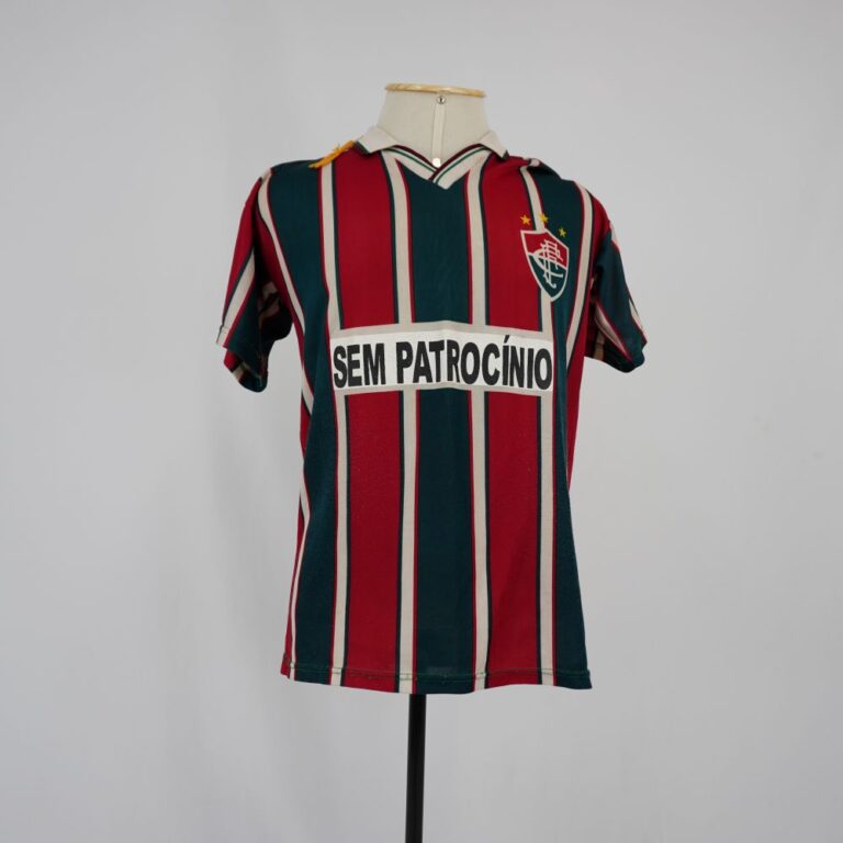 by Michelle Araujo Leia Mais...Camisa de time de futebol em malha sintética listrada verticalmente nas cores vermelha, verde e branca. Escrito “SEM PATROCÍNIO” na frente e com o número 10 nas costas....