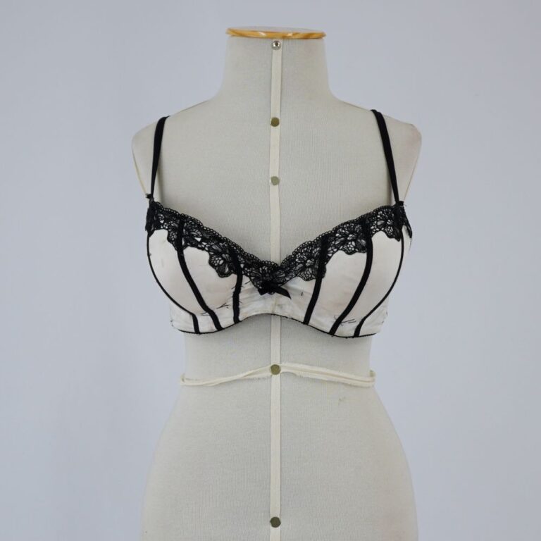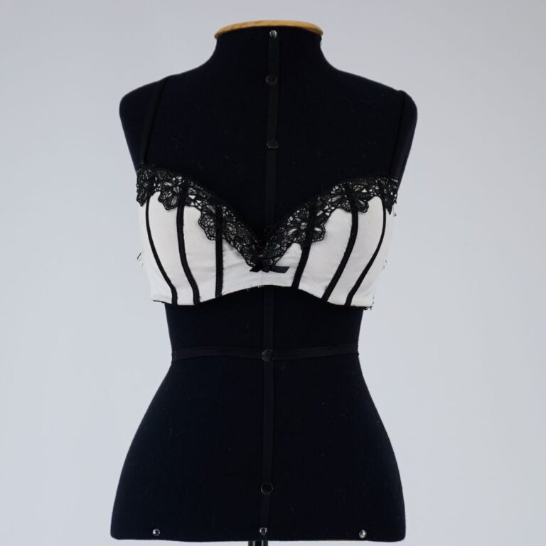 by Michelle Araujo Leia Mais...Sutiã branco com renda preta no decote e faixas pretas costuradas. Lateral e alças em tule preto, fechamento com colchete. Com bojo.