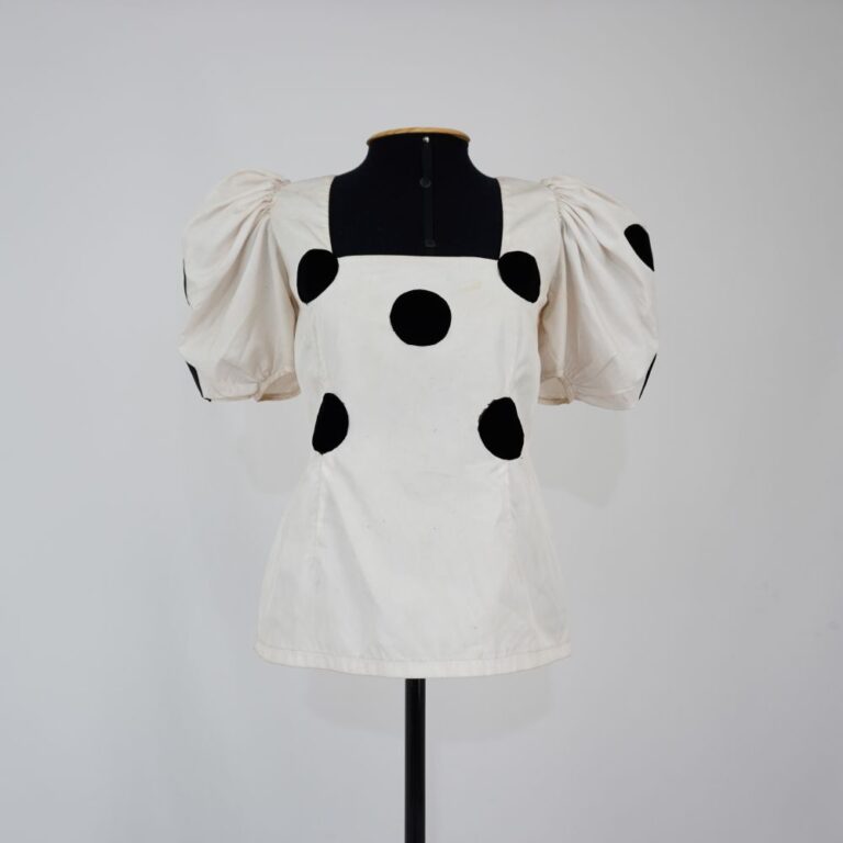 by Michelle Araujo Leia Mais...Blusa off white de manga curta bufante, decote quadrado, estampa de poá com aplicação em veludo, fechamento em velcro nas costas, fechamento original em botões de madrepérola, tule...