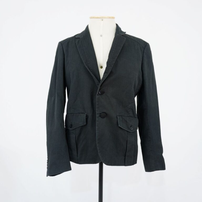 by Michelle Araujo Leia Mais...Blazer preto, dois bolsos frontais com prega macho e aba com fechamento em botão, dois bolsos internos, fechamento com dois botões de plástico e cinco botões decorativos em...