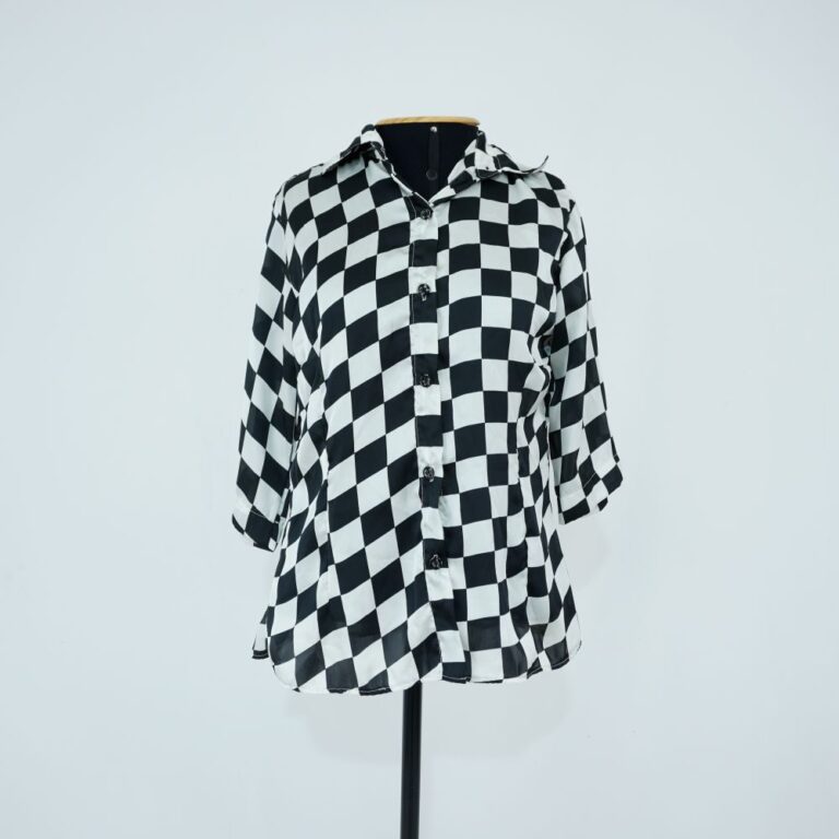 by Michelle Araujo Leia Mais...Camisa preto e branco com tecido fluido. Colarinho de camisa e manga na altura do cotovelo. Duas pences atrás para acinturar. Barra frontal arredondada.