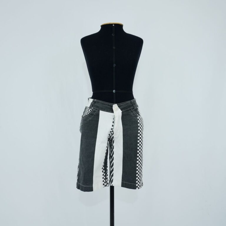 by Michelle Araujo Leia Mais...Bermuda preta e branca, cós de calça com passador, botão e zíper. Dois bolsos falsos na frente e dois bolsos pequenos atrás. Estampa de listras grossas e pequenos...