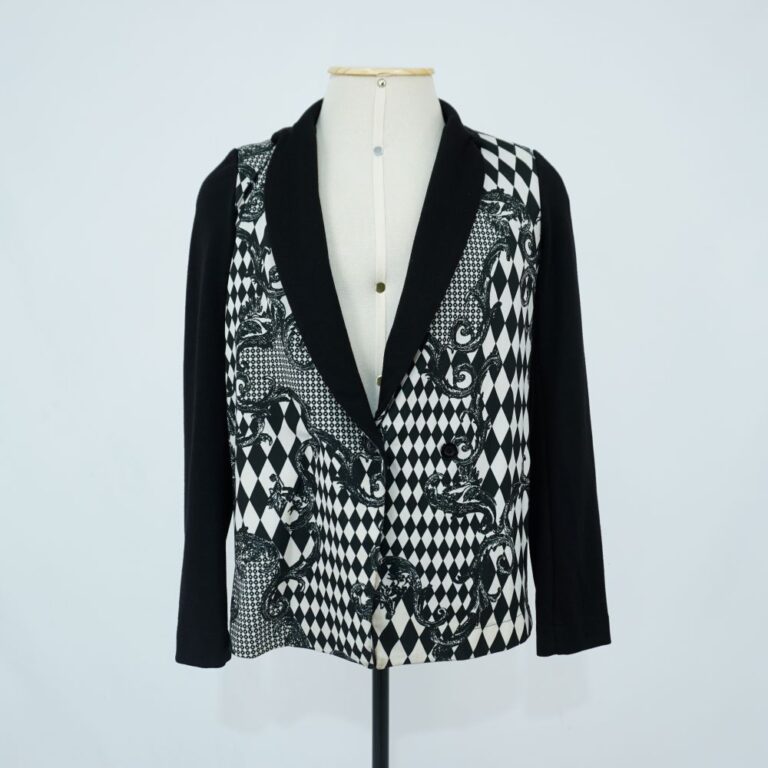 by Michelle Araujo Leia Mais...Blazer preto e branco estampado, com fenda nas costas, ombreiras, acabamento interno verde e amarelo e fechamento por botão duplo frontal.