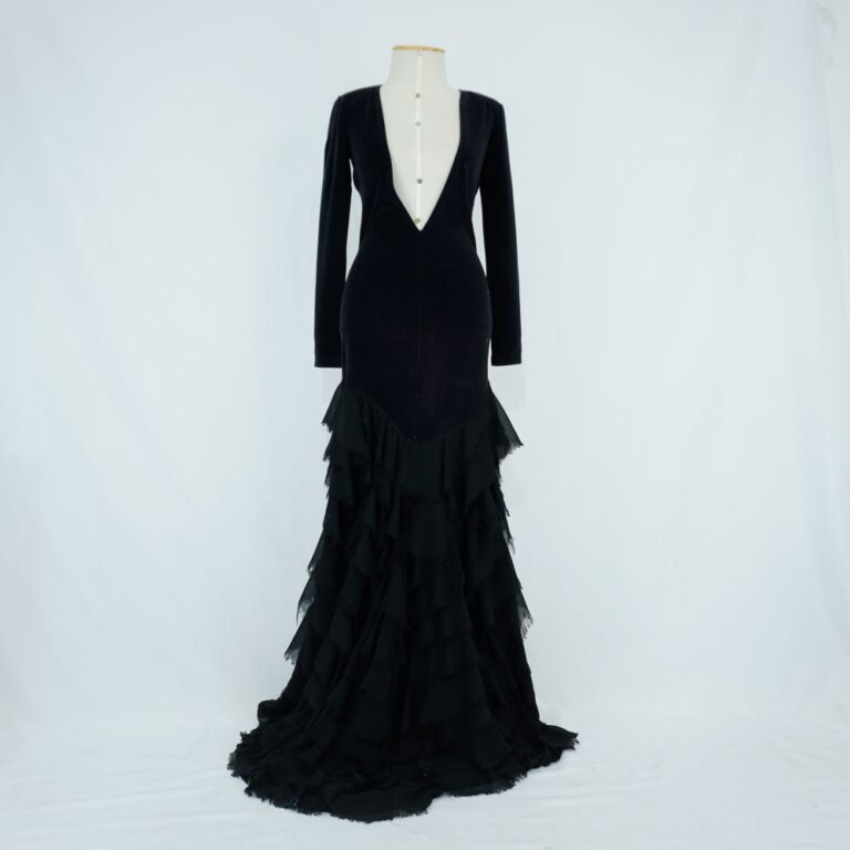by Michelle Araujo Leia Mais...Vestido longo preto de manga longa com ombreiras, decote nas costas e cauda; com tiras de amarração no ombro