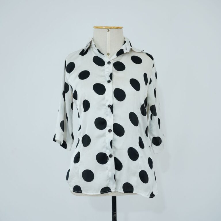 Camisa preto e branco com tecido fluido. Colarinho de camisa e manga na altura do cotovelo. Duas pences atrás para acinturar. Barra frontal arredondada. Estampa em bolas grandes...