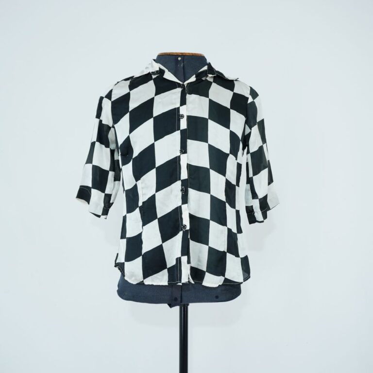 by Michelle Araujo Leia Mais...Camisa preto e branco com tecido fluido. Colarinho de camisa, manga na altura do cotovelo e duas pences atrás para acinturar. Estampa de quadrados branca e preta. Barra...