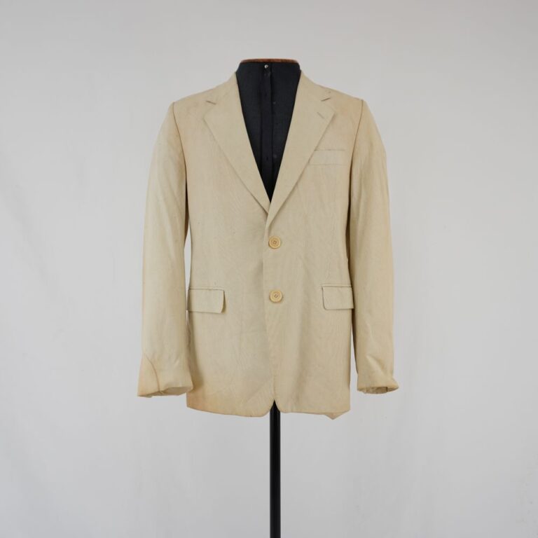 Paletó cinza azulado com vista dupla, gola, botões e abertura dos dois bolsos frontais falsos em veludo marrom. Fechamento com botão de pressão e botão caseado.