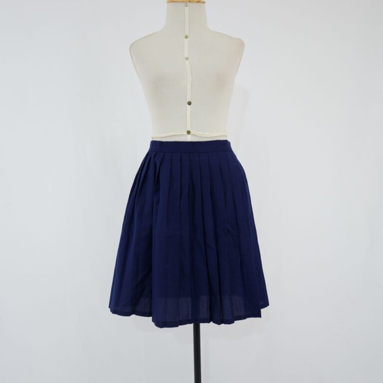 by Michelle Araujo Leia Mais...Saia azul marinho curta pregueada, fechamento em colchetes no cós