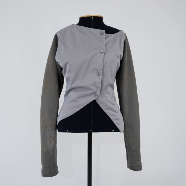 by Michelle Araujo Leia Mais...Blusa cinza claro com botões decorativos e fechamento em botão de pressão, mangas em cinza escuro com textura acobreada de cobra