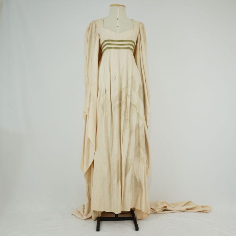 by Michelle Araujo Leia Mais...Vestido longo modelo império bege, com cauda acoplada, manga longa pendente, com aplicação de três fitas sob o busto, fechamento de zíper no meio das costas com colchete