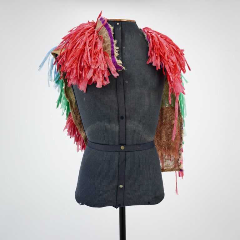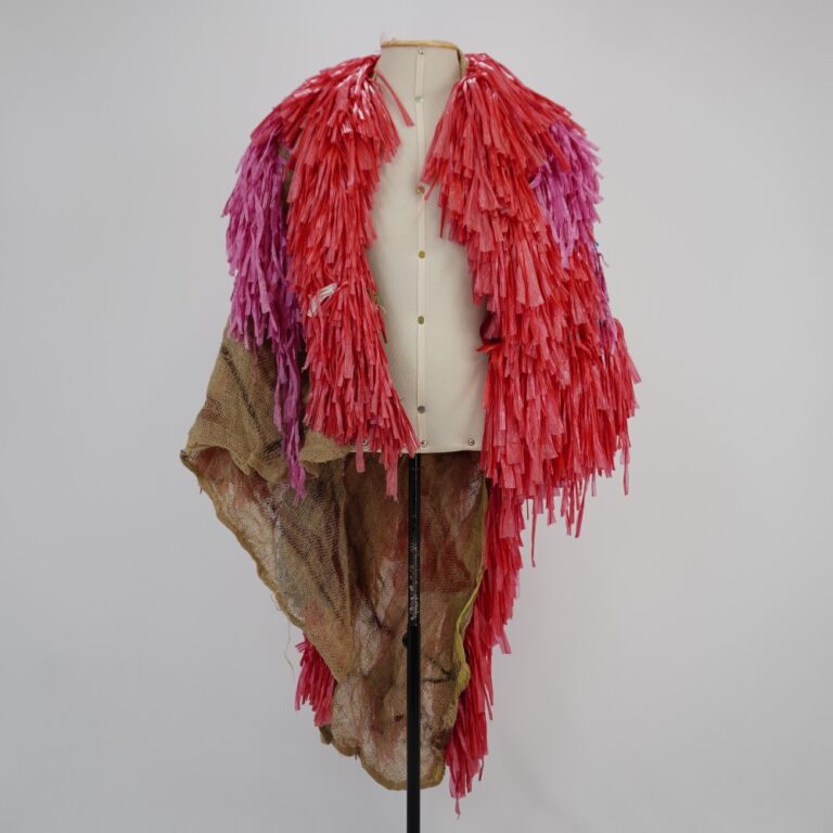 by Michelle Araujo Leia Mais...Parangolé base triangular de juta com viés em duas extremidades, aplicações de franjas de plástico vermelho, rosa e azul, com elástico vermelho amarrado em uma das pontas criando...