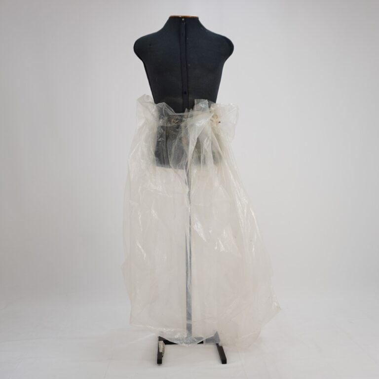 by Michelle Araujo Leia Mais...Vestido longo de plástico transparente, franzido no pescoço com fita adesiva e abertura para braço