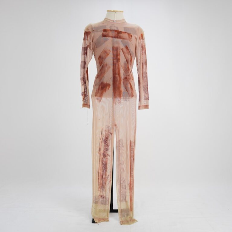 Macacão manga longa bege justo ao corpo, com transparência. Pintura de manchas de vários tons de vermelho. Barras na manga e na calça. Acabamento em overlock na gola.