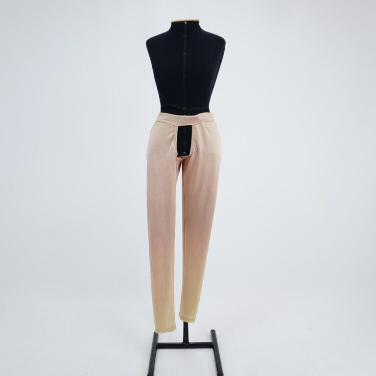 by Michelle Araujo Leia Mais...Calça legging bege com recortes vazados no meio frente, região genital e dois vazados traseiros para as nadegas. Tecido com leve brilho cós com elástico embutido