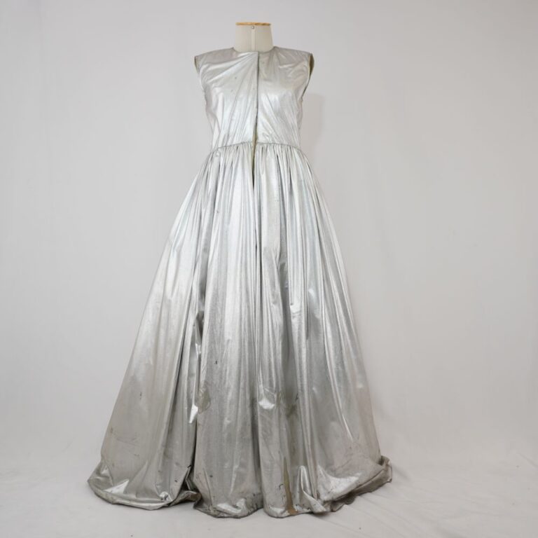by Michelle Araujo Leia Mais...Vestido longo sem mangas em lamê prata, saia volumosa e com enchimento de celofane furtacor e TNT amarelo, fechamento em velcro na frente
