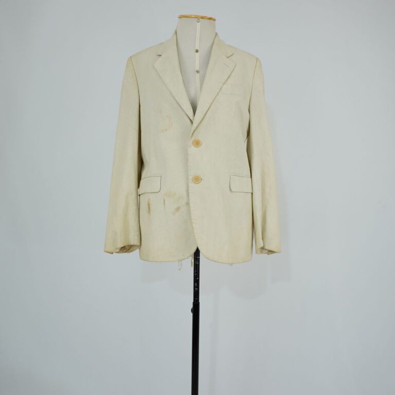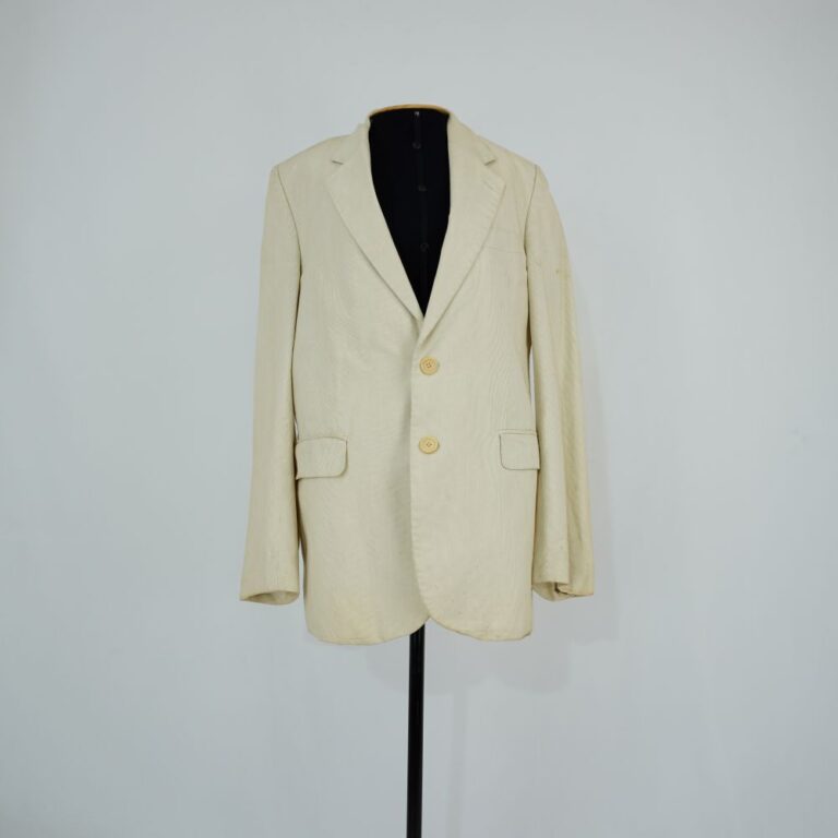 by Michelle Araujo Leia Mais...Blazer bege com três bolsos frontais, fechamento em botão de plástico e três bolsos internos