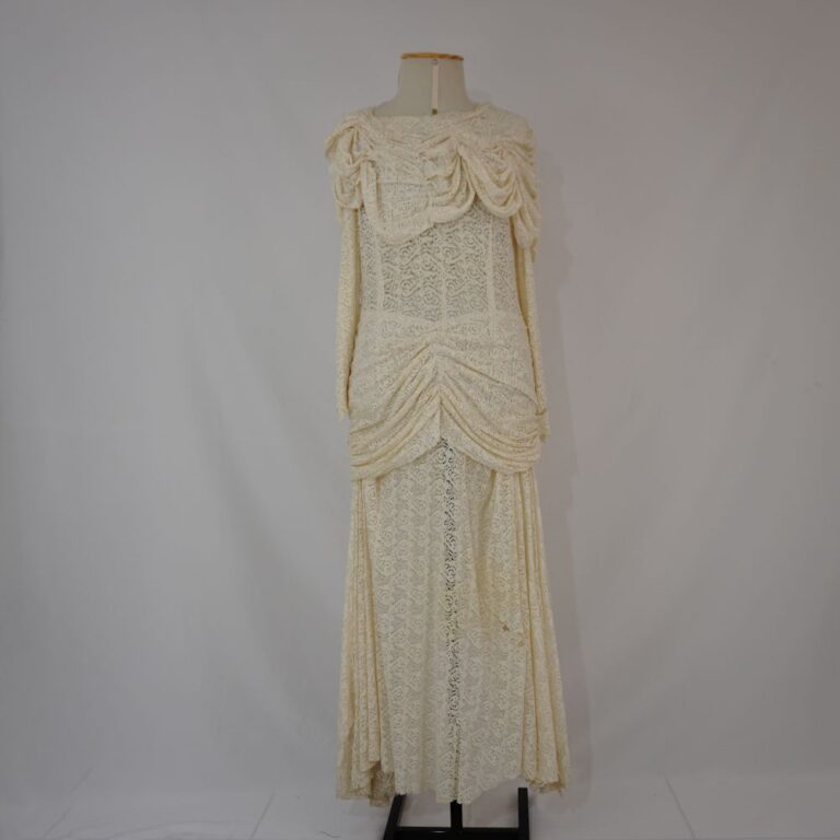 by Michelle Araujo Leia Mais...Vestido off white de renda, longo, manga longa, com franzidos nas mangas e decote no busto, cintura e costas. Fechamento com zíper nas costas. Saia em modelagem godê.