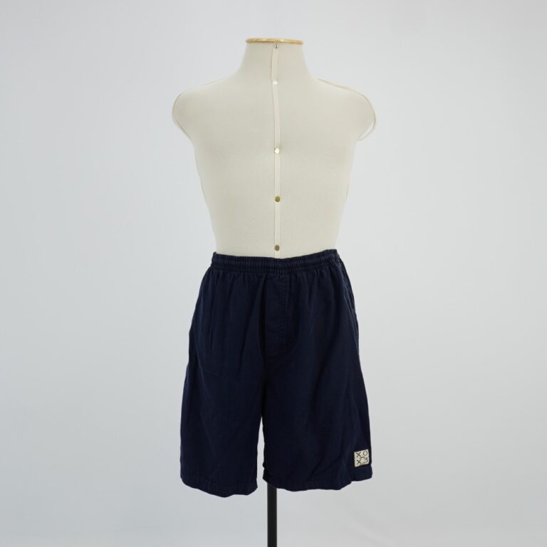 by Michelle Araujo Leia Mais...Bermuda azul marinho com dois bolsos frontais laterais, um bolso traseiro aplicado no lado direito, cós franzido com cordão para amarração. Aplicação de patch off white escrito “X.O.X.3”...