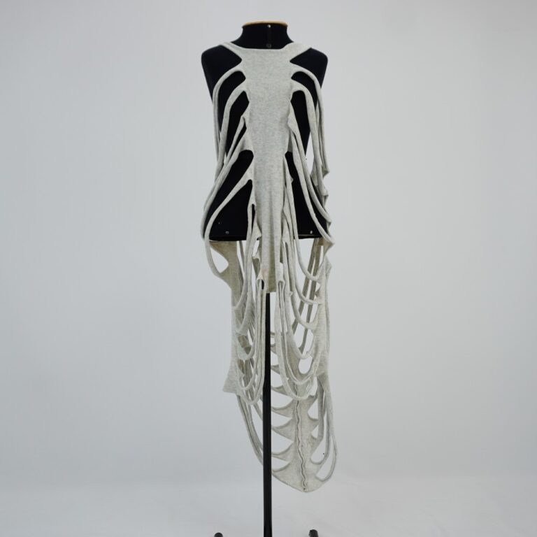 by Michelle Araujo Leia Mais...Vestido sem mangas cinza claro, cortes a fio horizontais em fileiras paralelas criando efeito de camadas que simulam estrutura óssea de costela e caixa torácica