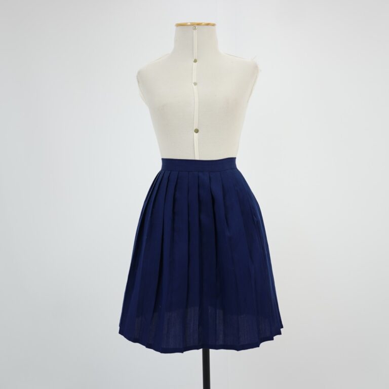 Saia azul marinho curta, pregueada, cós com fechamento em velcro e um botão decorativo preto