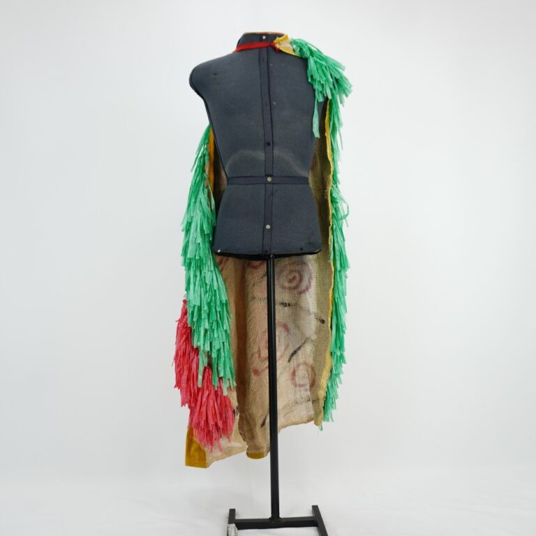 by Michelle Araujo Leia Mais...Parangolé base triangular de juta com viés em duas extremidades, aplicações de franjas plásticas em vermelho, azul e verde, com elástico vermelho amarrado em uma das pontas criando...
