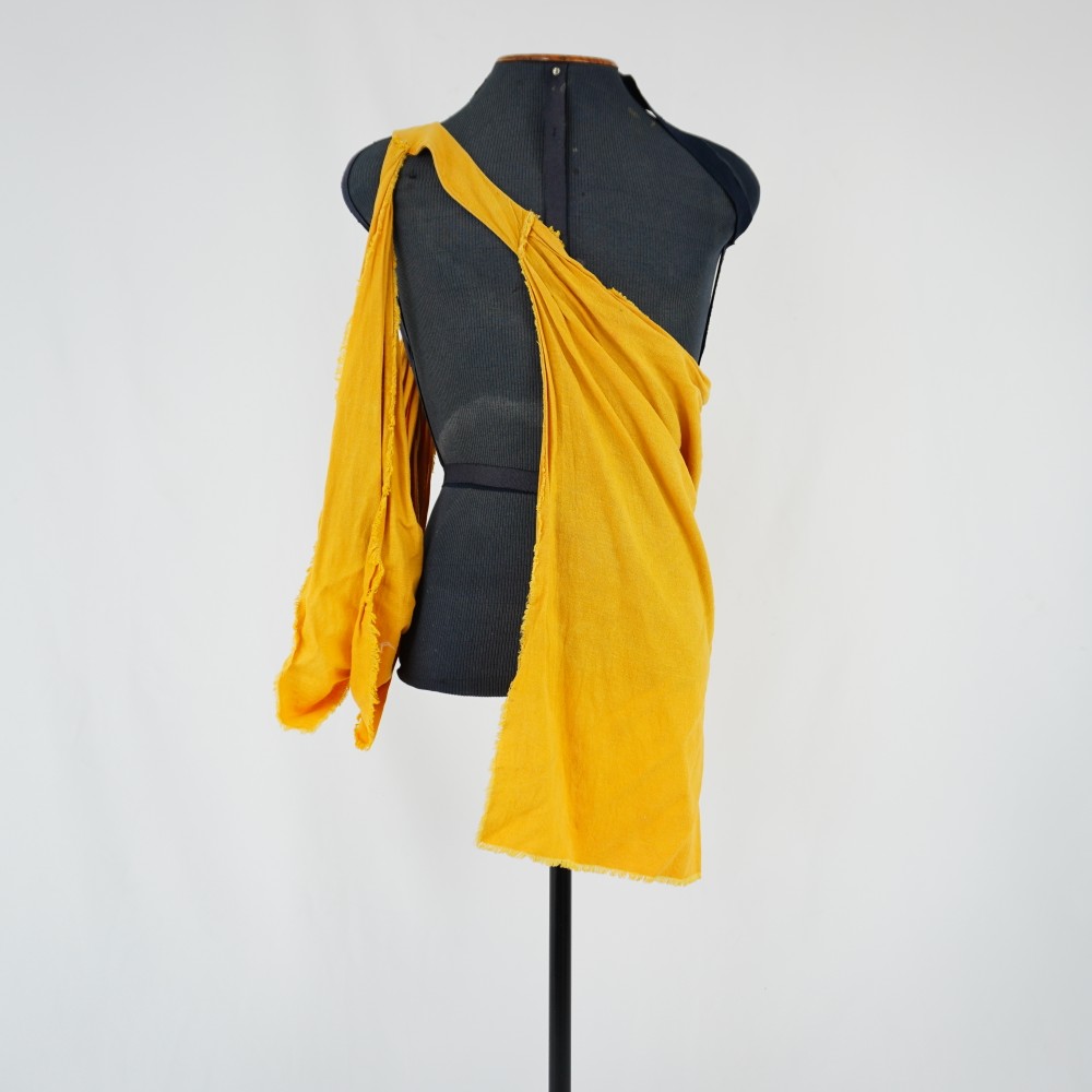 by Michelle Araujo Leia Mais...Acessório de figurino assimétrico com dois quadrados costurados em uma espécie de revel/cós, todo na cor mostarda, tecido em passamento, tela simples