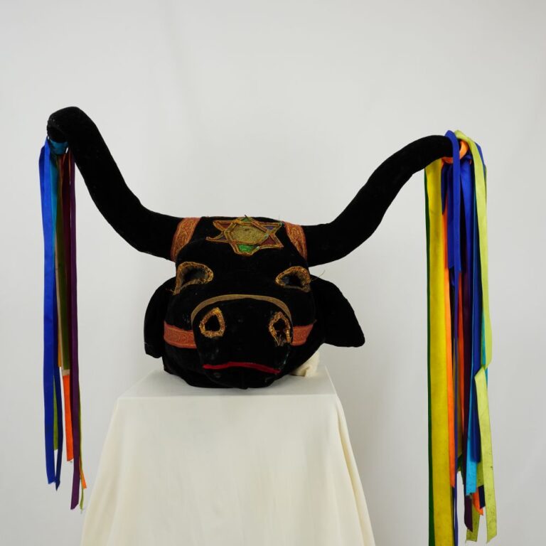 by Michelle Araujo Leia Mais...Cabeça de boi de veludo preto, com fitas de cetim, em ambos os chifres e apliques de fitas jacquard e lantejoulas, tule metalizado nos olhos