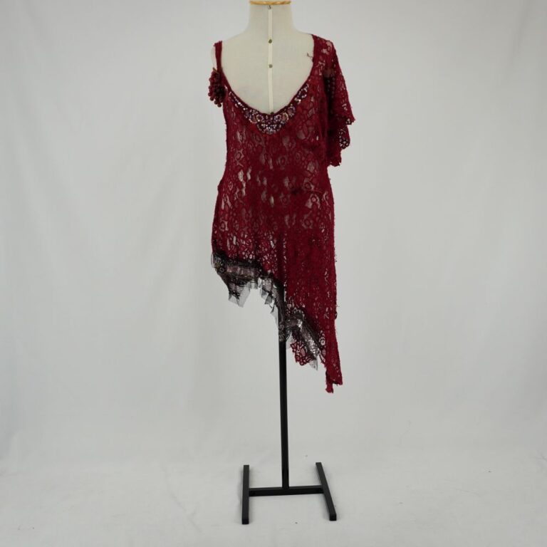 by Michelle Araujo Leia Mais...Vestido assimétrico sem manga em renda bordô com aplicação de aviamento de tule bordado com paetê transparente, miçangas furta cor e cobre na barraNo decote frontal é aplicado...