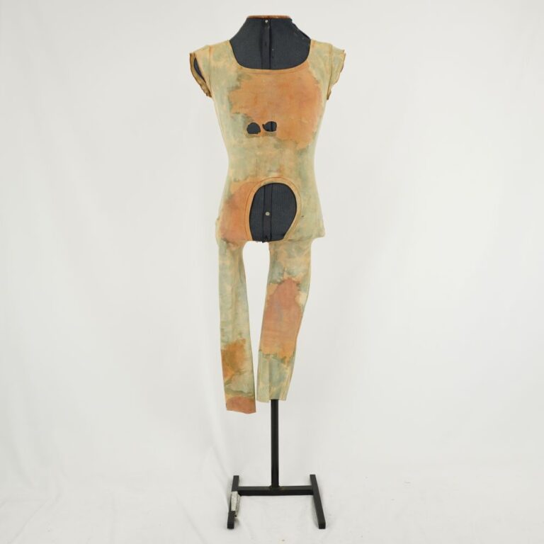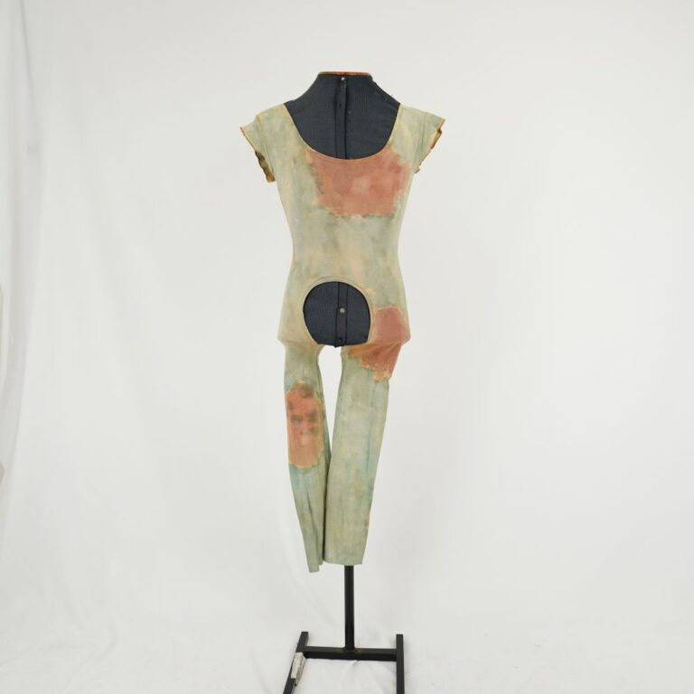 by Michelle Araujo Leia Mais...Macacão manga curta, pintado à mão com manchas marrons e verde azulados, com abertura na virilha
