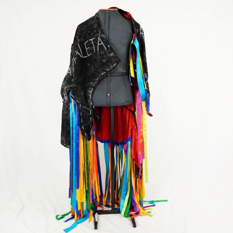 by Michelle Araujo Leia Mais...Capa preta com forro vermelho, feita de pedaços nomeados com “partes de carne” em prateado e lantejoulas que se unem por velcro, com fitas coloridas no barrado