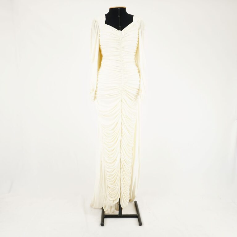by Michelle Araujo Leia Mais...Vestido de malha sintética off white, manga longa com aberturas, corpo franzido/com drapeado horizontal e bordados de pérolas, possui tecido nas costas que forma uma capa, fechamento em...