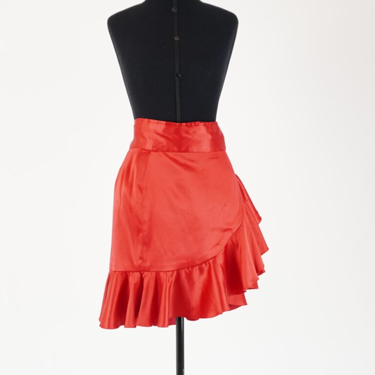 by Michelle Araujo Leia Mais...Saia peplum transpassada curta, tecido levemente acetinado vermelho, fechamento botão de pressão e velcro