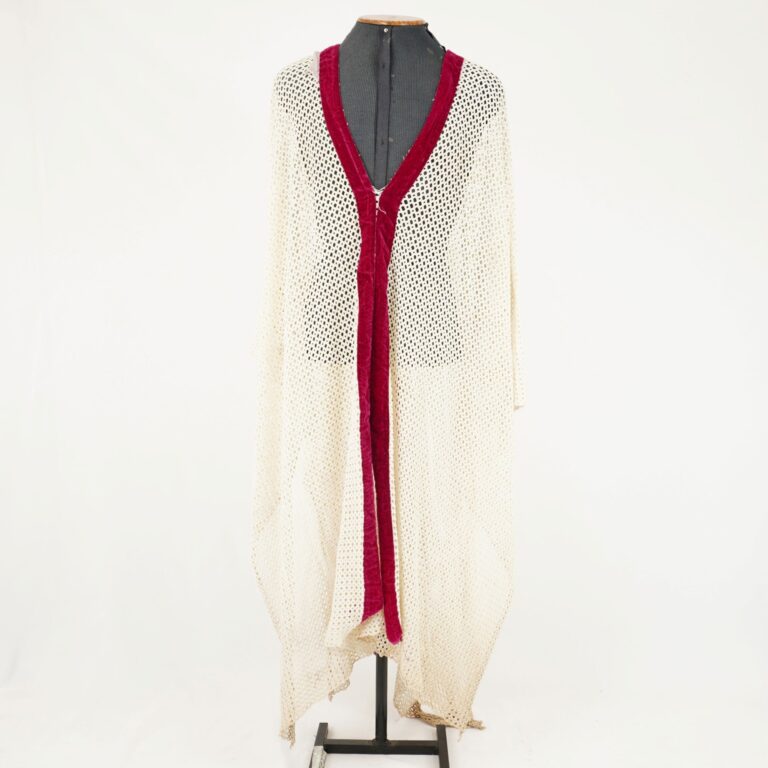 by Michelle Araujo Leia Mais...Kafkan longo aberto em malha tipo tela off white, com detalhe de faixa em veludo magenta no meio da peça na frente e nas costas da altura do...