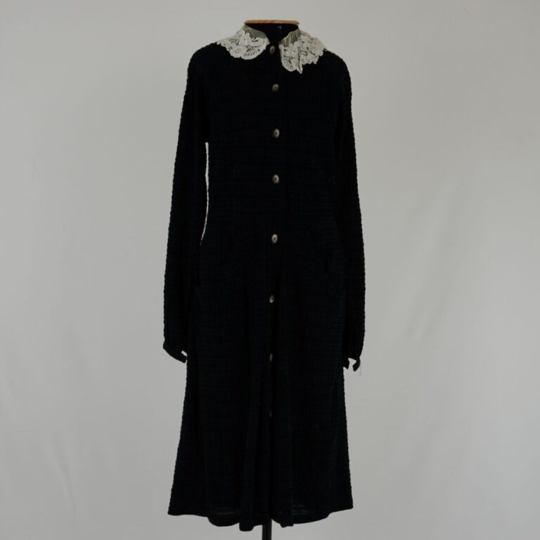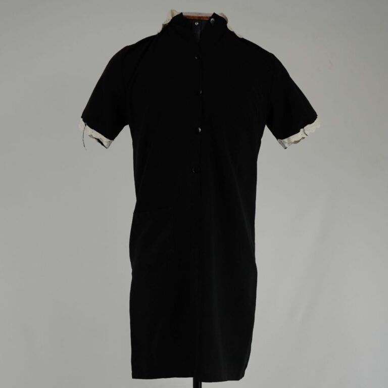by Michelle Araujo Leia Mais...Vestido uniforme tipo copeira em tecido plano sintético preto com fechamento frontal em botão de plástico preto. Bolso aplicado na frente direita e rendas na gola e na...