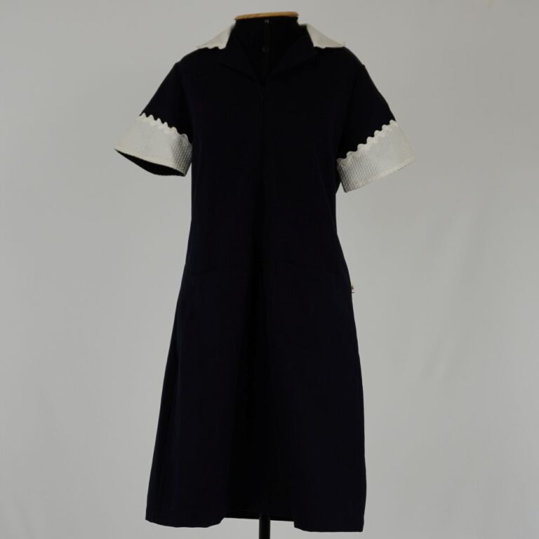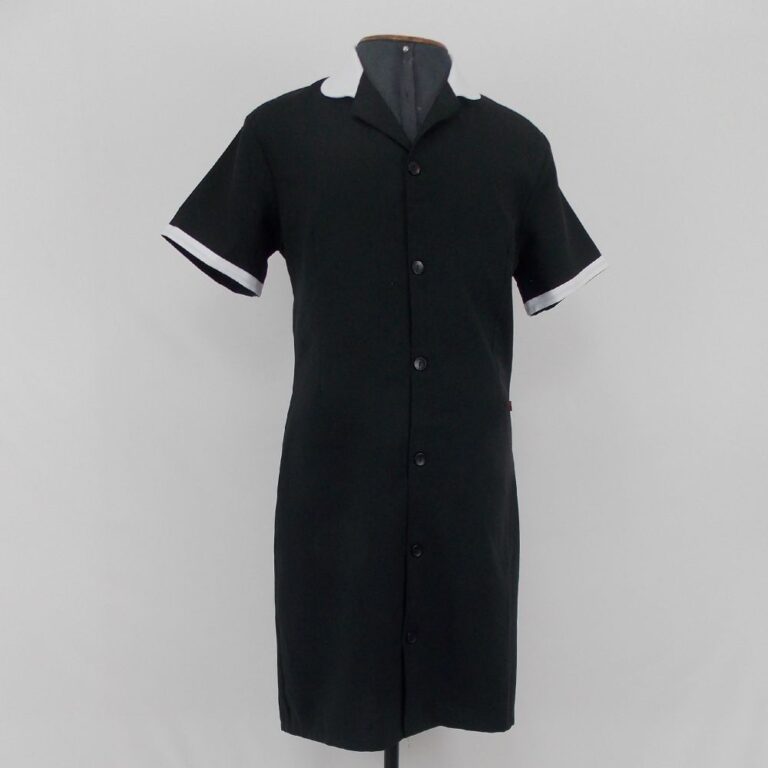 Vestido uniforme tipo copeira em tecido sintético na cor preta com abertura frontal em zíper invisível. Dois bolsos aplicados na frente, detalhe na gola e na barra da...