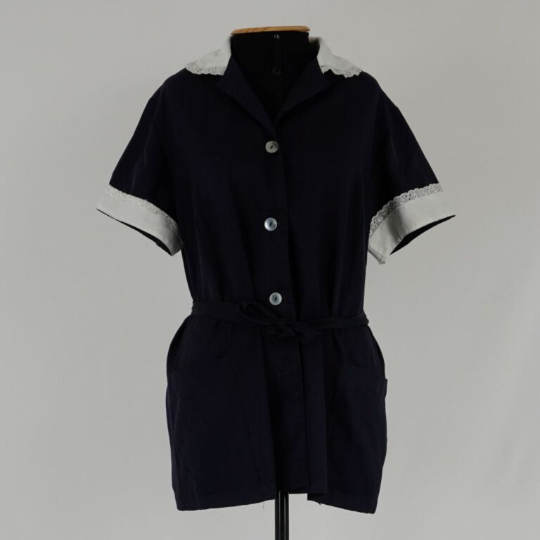 by Michelle Araujo Leia Mais...Vestido uniforme tipo copeira em tecido plano sintético preto com fechamento frontal em botão de plástico preto. Bolso aplicado na frente direita e esquerda. Faixa branca e rendas...