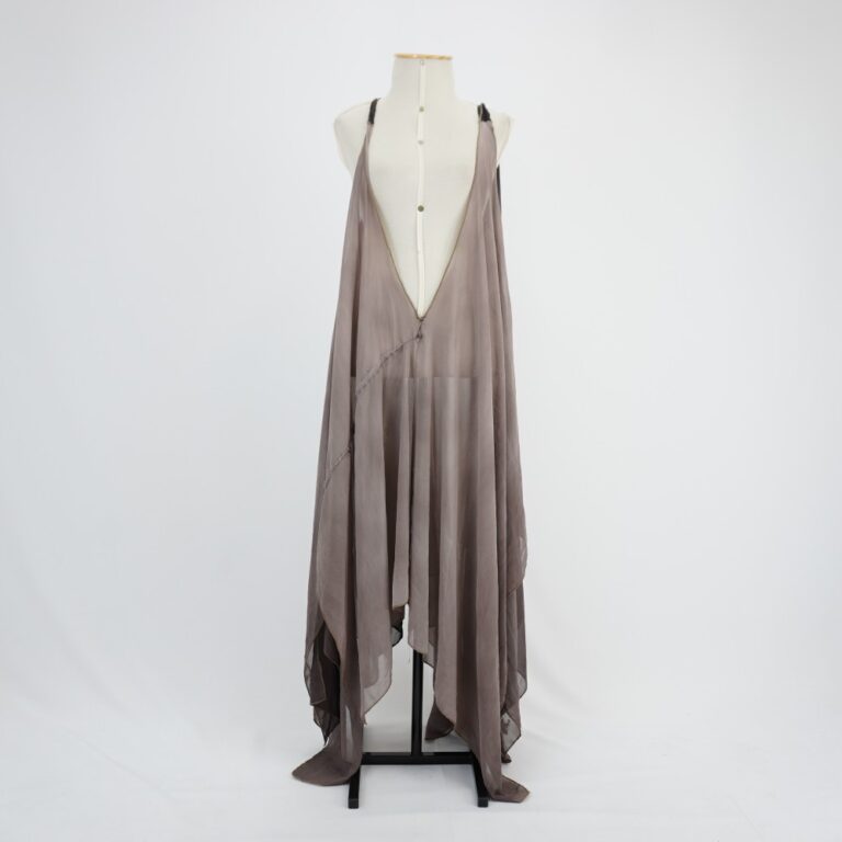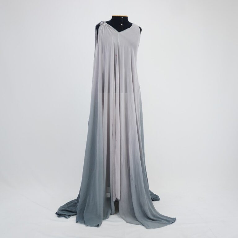 by Michelle Araujo Leia Mais...Túnica cinza com tecido transparente e fluído cinza degradê. Decote em “v”. Duas longas faixas de mesmo tecido no ombro.