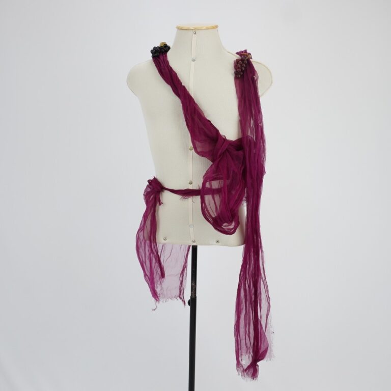 by Michelle Araujo Leia Mais...Adereço de figurino composto por faixas e amarração em tecido translúcido. Aplicação de uvas de plástico nos ombros.