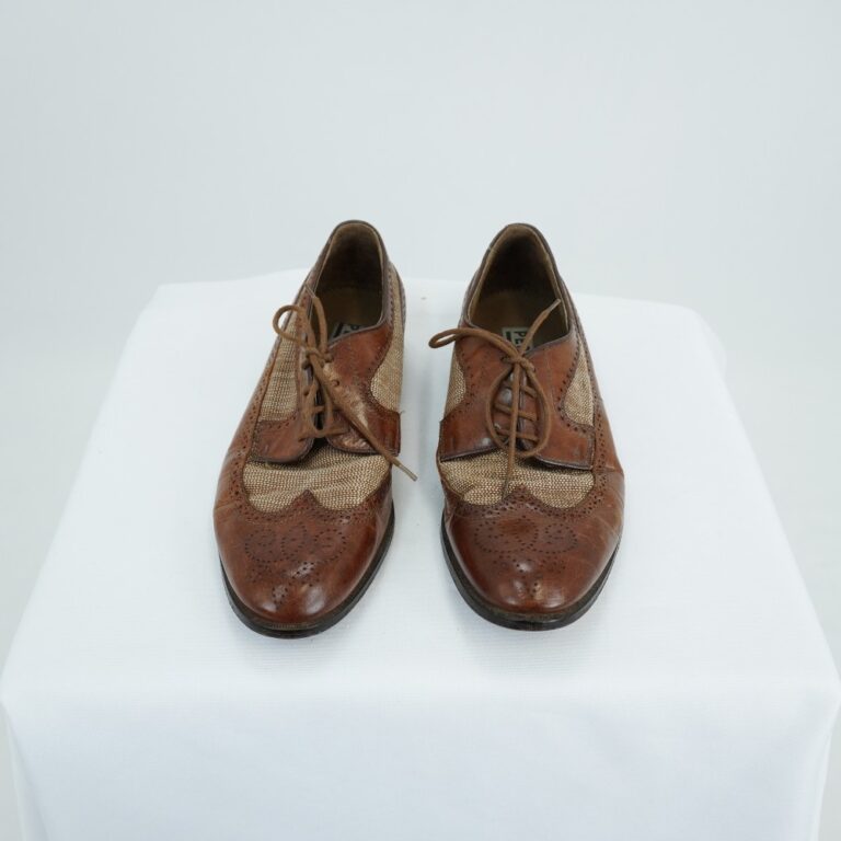 by Michelle Araujo Leia Mais...Sapato mocassim marrom, feito de dois materiais. Bico, laterais e amarração em couro marrom, corpo do sapato em lona marrom. Solado de couro